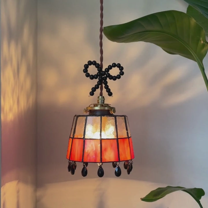 Amber Orange Stained Glass Pendant Light Plug-in with Beaded Bow