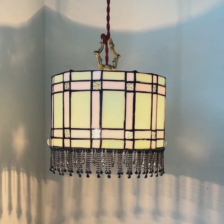 A refined Art Deco pendant light featuring handmade stained glass, elegant brass hardware, and delicate tassel fringe.