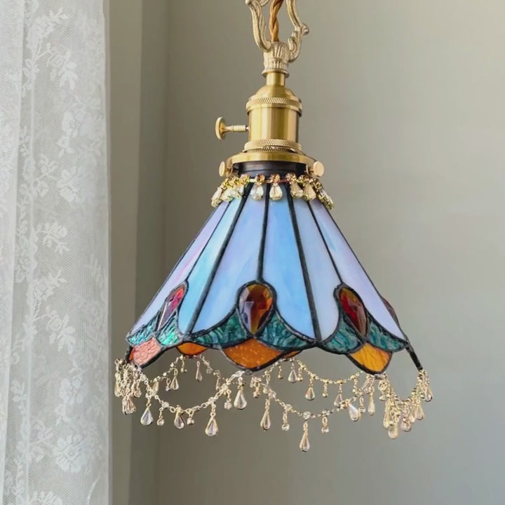 Add a warm vintage glow to your space with the Jewel Bloom Stained Glass Pendant Light – Amber Gem. This elegant pendant light features a softly scalloped stained glass shade with warm amber gem accents, pale blue panels, blush undertones, and delicate crystal fringe that catches the light beautifully.