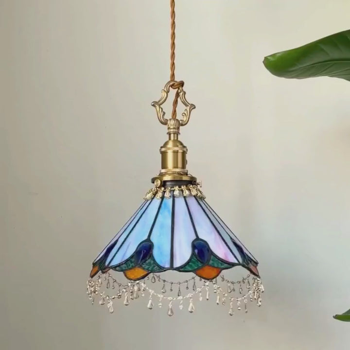 A vintage-inspired stained glass pendant light with blue gem accents, crystal fringe, and a warm elegant glow.