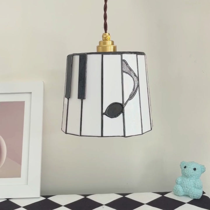 The shade is made from stained glass panels in a warm ivory tone with bold black accents, paired with brass-toned hardware for a timeless look. When lit, it gives off a gentle warm glow that adds atmosphere without overwhelming the room. Even when turned off, the piano-inspired design remains a beautiful decorative piece.